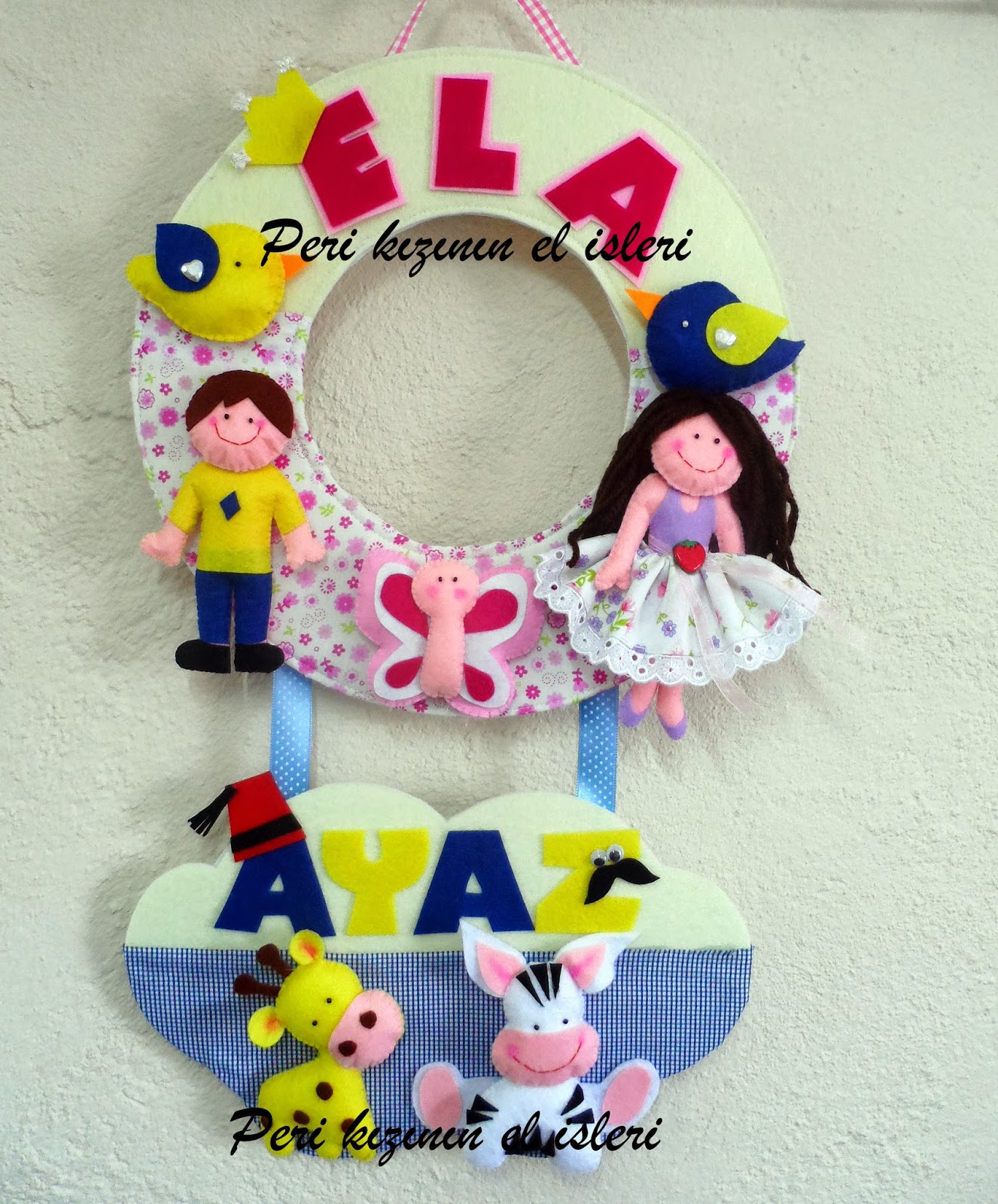 Kardeş kapı süsü. Sepetlerin altında kurdele ile sarkıtılarak balon ile uyumlu renklerde isim veya yazı yazılır. Filli kasnak kardeş kapı süsü. Kardeşler uçak kız pilot kapı süsü güneşli mutlu bir günde bulutların arasından sizleri gülerek selamlayan keçeden kız pilot çocuk mavi uçak ve altında keçeden düz harflerle birden çok isim ve yazı yazılı olan bebek kapı süsü. Bulutlar üzerine isimler nakış gibi dikilerek işlenmektedir.